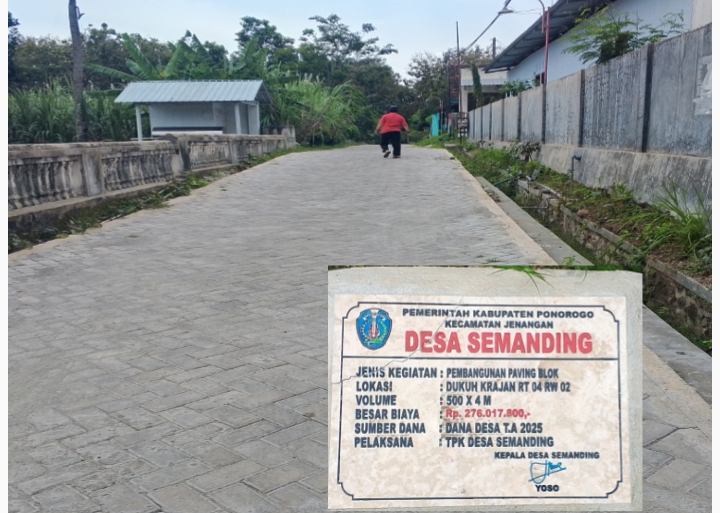 TKN Ponorogo – Pembangunan Pavingisasi blok jalan Dukuh Krajan RT 04 RW 02 Desa Semanding Kecamatan Jenangan Kabupaten Ponorogo Provinsi Jawa Timur. perlu di pertanyakan.